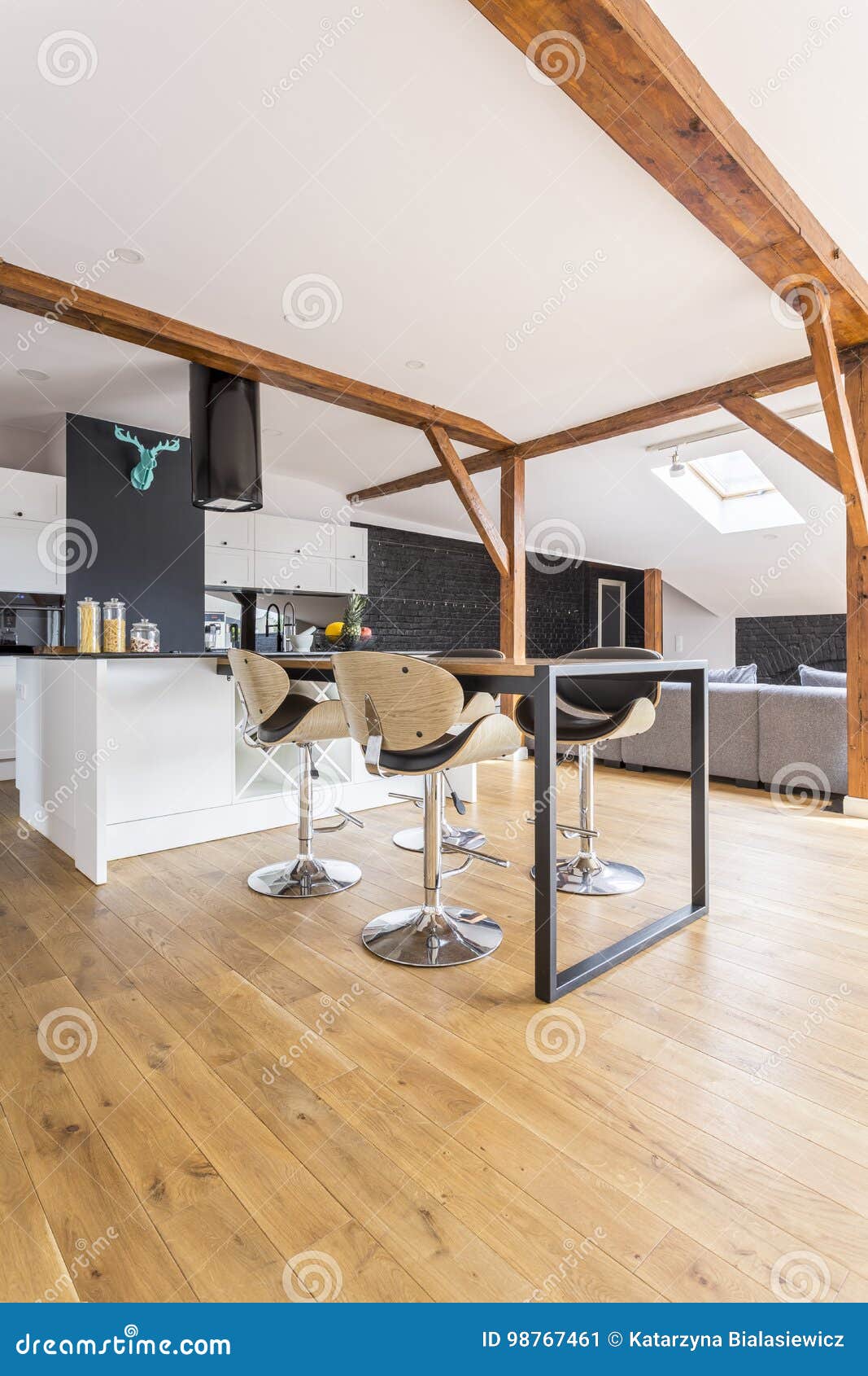 Cocina Luminosa En El Diseno Interior Minimalista Blanco Y Negro Con Mesa De Comedor Decorado Con Plantas De Interior Cerca De Enormes Ventanas